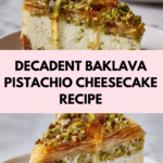 This decadent Baklava Pistachio Cheesecake combines the rich, creamy texture of classic cheesecake with the sweet, nutty flavors of baklava. A buttery pistachio crust supports a luscious cream cheese filling topped with crisp, honeyed filo layers, pistachios, and traditional baklava syrup, resulting in a dessert that is both visually stunning and irresistible in taste.