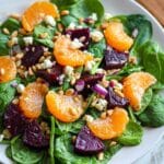 A vibrant and refreshing Beet Salad featuring tender cooked beets, fresh baby spinach, sweet mandarin oranges, crunchy toasted pine nuts, and tangy crumbled feta cheese, all tossed in a luscious honey-mustard lemon dressing. This salad beautifully balances earthy, sweet, and zesty flavors, making it a perfect light meal or side dish for any occasion.