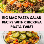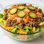 This Big Mac Pasta Salad is a flavorful and hearty dish that combines the classic flavors of a Big Mac burger with protein-packed chickpea pasta and a creamy homemade dressing. Ground beef is cooked with Worcestershire sauce and mixed with fresh vegetables, sharp cheddar, and dill pickles for a delicious twist on traditional pasta salad, perfect for a satisfying lunch or dinner.