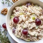 A refreshing and creamy California Chicken Salad featuring shredded chicken breast combined with mayonnaise, Greek yogurt, grapes, celery, walnuts, and thyme. This easy-to-make salad is perfect for a light lunch or as a flavorful side dish, served chilled for the best taste.