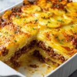 A layered baked dish inside a white rectangular ceramic dish, showing a golden-brown top with melted cheese slightly browned in spots, sprinkled with small green herbs. The top layer is made of smooth thin slices of yellow potatoes, slightly crisp and shiny from melted cheese. Below it is a thick layer of cooked ground meat, brown and crumbly with a moist texture. Under the meat is another layer of pale yellow potato slices, soft and cooked through. The bottom of the dish contains a creamy sauce that looks rich and slightly bubbling. Some layers are visible on the side where a portion has been removed, showing three clear layers: potato, meat, and potato, with cheese melted on top. The dish is placed on a white marbled surface. photo taken with an iphone --ar 4:5 --v 7
