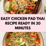 This Chicken Pad Thai recipe features tender pieces of chicken breast or thighs stir-fried with fresh vegetables, rice noodles, and a flavorful, tangy sauce made from tamari, fish sauce, lime juice, and a hint of sweetness. Garnished with crunchy peanuts and fresh cilantro, and served with lime wedges, this classic Thai dish is perfect for a quick weeknight meal that delivers authentic taste and satisfying textures.