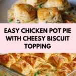 This comforting Chicken Pot Pie with Biscuits combines tender shredded chicken, creamy vegetables, and melted cheese, all topped with golden, buttery biscuit pieces. Baked to perfection, it’s a hearty and delicious dish perfect for family dinners or cozy nights in.