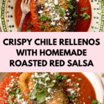 This classic Chile Relleno recipe features roasted poblano peppers stuffed with a savory cheese filling, coated in a fluffy egg batter, and fried to golden perfection. Served with a smoky homemade roasted red salsa and topped with queso fresco or cotija cheese, this dish is a vibrant and satisfying Mexican favorite perfect for a hearty meal or festive occasion.