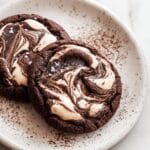Two thick, round chocolate cookies sit on a white plate with speckled details, resting on a white marbled surface. Each cookie has a cracked texture and is topped with a marbled swirl of light cream and dark chocolate, creating a flowing, wavy pattern over the surface. The cookies show some salt flakes sprinkled on top and a bit of cocoa powder dusted on the plate near them, adding a touch of texture and contrast. Photo taken with an iphone --ar 4:5 --v 7
