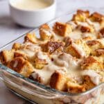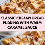 This classic Bread Pudding recipe combines soft, cubed white bread soaked in a rich mixture of milk, butter, eggs, and spices, then baked to golden perfection. Enhanced with plump raisins and a warm nutmeg aroma, it’s served with a luscious homemade caramel sauce, making it a comforting dessert perfect for any occasion.