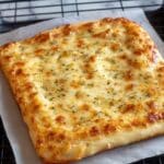 A rectangular flatbread with a golden brown crust is shown resting on white parchment paper on a black cooling rack. The bread has a soft, slightly puffed texture with small dimples across the surface. On top, melted cheese with lightly browned spots is spread evenly, with some small herbs sprinkled in dark green, adding color contrast. The edges have a crispy, slightly darker finish, suggesting it is freshly baked. The background is altered to a white marbled texture. photo taken with an iphone --ar 4:5 --v 7