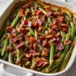 Keywords: crack green beans, baked green beans, green bean casserole, bacon green beans, sweet and savory green beans, holiday side dish