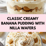 This classic Banana Pudding recipe features layers of creamy vanilla pudding, whipped cream, ripe bananas, and crunchy Nilla Wafers. The pudding is made with sweetened condensed milk and instant vanilla pudding mix, then folded with freshly whipped cream for a light and airy texture. Layered in a dish and chilled to perfection, this dessert is a comforting Southern favorite that’s perfect for family gatherings or any occasion.