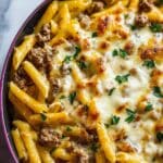 This Creamy High Protein Beef Pasta combines tender penne pasta with a rich, flavorful ground beef sauce enhanced by Greek yogurt and melted cheddar cheese for a delicious, protein-packed meal perfect for any weeknight dinner.