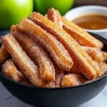 5. Serve: While the apple fries are still hot, sprinkle them with the remaining cinnamon-sugar mixture for extra sweetness. Serve immediately with caramel sauce or vanilla yogurt for dipping.