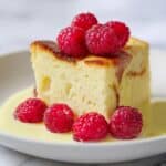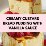 This classic Custard Bread Pudding with Vanilla Sauce is a rich and comforting dessert made with French bread soaked in a creamy custard mixture, baked to perfection in a water bath for a smooth and custardy texture. Topped with a golden, crunchy crust, it’s delicious served warm alongside fresh berries or caramel sauce.