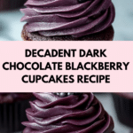 Decadent dark chocolate blackberry cupcakes topped with rich chocolate frosting and garnished with fresh blackberries and chocolate shavings. Perfect for chocolate lovers seeking a fruity twist in their dessert.