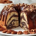 Indulge in the rich and nutty flavors of this Decadent German Chocolate Pecan Pound Cake Delight. Moist and tender, this classic bundt cake combines smooth German chocolate and crunchy toasted pecans, complemented by a luscious chocolate pecan glaze that elevates every bite. Perfect for celebrations or a special treat.