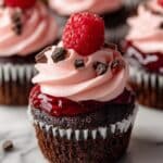 These Decadent Raspberry Chocolate Lava Cupcakes feature a rich, moist chocolate cake with a molten raspberry center, topped with a luscious raspberry buttercream frosting and fresh raspberries for garnish. Perfect for chocolate and fruit lovers looking for an indulgent dessert that combines a gooey filling with smooth frosting.