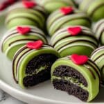These Delicious Grinch Oreo Balls are a festive and fun holiday treat made by combining crushed Red Velvet Oreos with creamy softened cream cheese, coated in vibrant green candy melts, and topped with charming red candy hearts. Perfect for holiday parties or gifting, these no-bake treats bring a playful twist to classic Oreo truffles with their colorful appearance and irresistible taste.