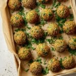 The image shows a baking tray lined with light brown parchment paper on a white marbled texture surface. On the tray, there are 18 round falafel balls arranged in neat rows, each ball covered with a crust of mixed seeds and chopped green herbs, giving a rough, textured appearance. The falafel balls have a golden-brown color with visible green flecks and a slightly crunchy outer layer. Around the falafel balls, some fresh green herb leaves are scattered loosely, adding a fresh touch to the scene. Photo taken with an iphone --ar 4:5 --v 7