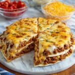 8. Repeat Layers: Add the second tortilla on top of the cheese, then another third of the beef mixture, followed by another third of the cheese. Repeat once more to build all three layers.