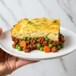 The image shows a slice of shepherd’s pie on a white plate, held by a woman's hand at the edge. The dish has two main layers: a bottom layer of cooked ground beef mixed with bright green peas and small carrot pieces in a rich brown sauce, and a thick top layer of golden-brown baked mashed potatoes with a slightly crispy texture. Small green herb leaves are sprinkled on top of the mashed potato layer. The background is a white marbled texture. photo taken with an iphone --ar 4:5 --v 7
