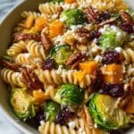 A vibrant and flavorful Fall Harvest Pasta Salad featuring roasted butternut squash and Brussels sprouts, sweet cranberries, crunchy pecans, and tangy feta cheese, all tossed with a balsamic vinaigrette. Perfect for a seasonal side dish or light main course.