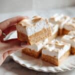 A close-up of a fluffy nutter bar held by a woman's hand, showing two distinct layers: the bottom layer is golden brown with a soft, crumbly texture, and the top layer is thick white marshmallow spread that looks light and slightly glossy with some air bubbles and a few golden toasted spots. In the background, a white plate with scalloped edges holds the rest of the nutter bars, all cut into squares with the white marshmallow layer evenly spread on top. The scene is set on a white marbled surface, enhancing the soft, inviting texture of the bars. Photo taken with an iphone --ar 4:5 --v 7