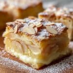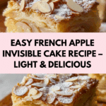 A delicate French Apple Invisible Cake featuring thinly sliced apples suspended in a light, fluffy batter. This cake is beautifully layered and baked until golden brown, finished with toasted almonds and a dusting of powdered sugar for an elegant dessert that’s both light and flavorful.