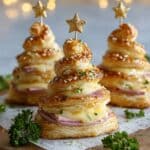 Ham & Cheese Puff Pastry Trees are festive and delicious appetizers perfect for holiday gatherings. Layers of flaky puff pastry, savory deli ham, and melty cheese are transformed into charming tree shapes using skewers, brushed with a garlic-parsley butter glaze, then baked to golden perfection.