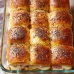 Delicious Ham and Havarti Cheese Sliders made with buttery Hawaiian rolls, layered with Black Forest ham and creamy Havarti cheese, topped with a flavorful poppy seed butter glaze and baked to golden perfection. A perfect appetizer or crowd-pleasing snack for any occasion.