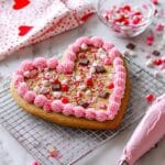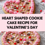 Keywords: heart shaped cookie cake, Valentine’s Day dessert, chocolate chip cookie cake, buttercream frosting, festive cookie cake, holiday dessert
