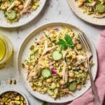 - Mix the Salad Ingredients: In a large mixing bowl, combine the cooked quinoa, shredded chicken, chopped cucumber, drained chickpeas, fresh parsley, chopped mint, diced red onion, crumbled feta, and shelled pistachios. Stir the ingredients gently to evenly distribute them.