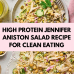 This High Protein Jennifer Aniston Salad is a vibrant, nutrient-packed dish featuring cooked quinoa, shredded chicken, fresh vegetables, chickpeas, and a zesty lemon-mustard dressing. It’s a perfect balance of protein and fresh flavors, enhanced with herbs, feta cheese, and crunchy pistachios, making it an ideal healthy lunch or light dinner.