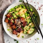 - Serve: Drizzle or dollop sriracha mayo over the bowls. Finish with a sprinkle of red pepper flakes and sesame seeds for added heat and crunch. Serve immediately and enjoy!