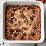 The image shows a baked dessert in a white square dish, with a golden brown, crumbly top layer filled with melted dark chocolate chips and pieces of pecans spread unevenly across the surface. The edges are slightly darker and crispier, adding texture contrast, while the center looks soft and gooey. The dish rests on a white marbled surface with scattered dark chocolate chips blurred in the background, creating a warm and inviting feel. Photo taken with an iphone --ar 4:5 --v 7