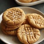 A white plate holds six round peanut butter cookies stacked slightly unevenly, showing their light brown, crackled surface with clear fork-pressed lines on top of each cookie. Some cookies have a few coarse salt crystals scattered on them, adding texture and a slight shine. The plate sits on a dark textured surface, with more cookies visible in a white rectangular dish in the blurred background. The overall look is warm and inviting with a focus on the cookies' soft texture and earthy color. photo taken with an iphone --ar 4:5 --v 7