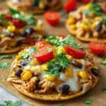Mexican Rotisserie Chicken Tostadas are crispy baked corn tortillas topped with a flavorful mixture of shredded rotisserie chicken, black beans, corn, and salsa, all seasoned with taco spices and melted Colby Jack cheese. Finished with fresh cilantro and tomatoes, these tostadas make a perfect quick and satisfying Mexican-inspired meal.