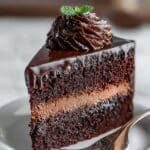 A close-up of a two-layer dark chocolate cake slice on a white plate with a silver fork beside it. The bottom and top layers are rich, moist dark chocolate cake, while the middle layer is smooth, slightly lighter chocolate mousse. The top of the cake is coated with a shiny dark chocolate glaze that drips slightly down the sides. A thick swirl of dark chocolate frosting with a rich, smooth texture sits on the top center, garnished with a small fresh green mint leaf. The background is soft and blurred with a white marbled texture surface under the plate. photo taken with an iphone --ar 4:5 --v 7