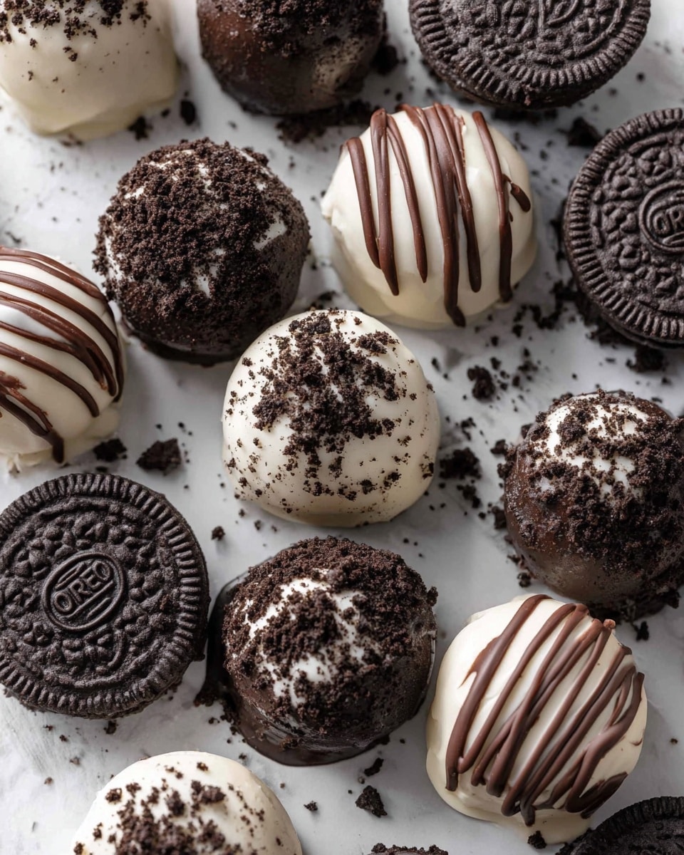 A white speckled plate filled with round truffles, some coated in smooth white chocolate and others in dark chocolate, each truffle sprinkled or drizzled with crushed dark cookie crumbs creating a textured look. The truffles sit on top of whole dark chocolate sandwich cookies evenly spread on the plate. The plate is placed on a white marbled surface with additional dark chocolate sandwich cookies and cookie crumb truffles scattered around it. The overall colors are dark brown, white, and black with a mix of smooth, crumbly, and drizzled textures, creating a rich and inviting display. Photo taken with an iphone --ar 4:5 --v 7