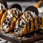 These Oreo Crunch Cheesecake Tacos are a delightful twist on classic desserts, combining crispy taco shells with creamy, sweet cheesecake filling and crunchy Oreo pieces. Finished with a smooth chocolate drizzle, they make a fun and delicious treat perfect for any occasion.