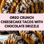 Keywords: Oreo cheesecake tacos, chocolate drizzle dessert, crispy taco shells, no-bake cheesecake filling, cinnamon sugar tortillas