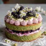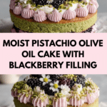 This Pistachio and Blackberry Olive Oil Cake is a moist and flavorful dessert that combines the nutty richness of pistachios with the sweet and tangy taste of blackberry preserves. Made with olive oil instead of butter, this cake features a tender crumb enhanced with almond and vanilla extracts, and is beautifully layered and topped with a creamy blackberry buttercream frosting. Perfect for special occasions or a refined everyday treat, it’s garnished with fresh blackberries and chopped pistachios for added texture and flavor.