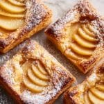 The image shows four square-shaped pastries with golden brown, flaky crust layers that look crisp and puffed on the edges. Each pastry has a neatly arranged layer of thinly sliced fruit, likely apple, fanned out in the center with a warm yellow to light brown color. A fine dusting of white powdered sugar covers parts of the pastries, adding a soft, snowy texture. They lie on a white marbled surface that highlights their warm tones and textures. photo taken with an iphone --ar 4:5 --v 7