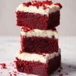 These red velvet brownies are a decadent twist on the classic brownie with a rich cocoa flavor, a striking red hue, and a smooth cream cheese frosting. Moist and fudgy with a subtle tang from vinegar, they make a perfect dessert for any occasion.