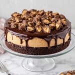 A three-layer round cake is displayed on a clear glass stand over a white marbled surface. The bottom layer is a dark brown chocolate cake base, textured and rich. Above it is a thick, smooth middle layer of peanut butter cream, light brown and creamy in appearance. The top layer is a glossy dark chocolate ganache dripping slightly over the edges. The ganache is generously topped with many small, chopped peanut butter cups scattered on the surface, giving a textured and crunchy finish. Photo taken with an iphone --ar 4:5 --v 7