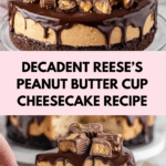Keywords: Reese’s Cheesecake, peanut butter cheesecake, brownie crust cheesecake, chocolate peanut butter dessert, layered cheesecake, peanut butter cups dessert