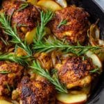 This Rosemary Apple Cider Chicken recipe features juicy, bone-in chicken thighs seasoned with aromatic spices and fresh herbs, seared to golden perfection, and then baked with sliced apples and red onions. Finished with a luscious pan sauce made from apple cider, Dijon mustard, and butter, this dish perfectly balances savory and sweet flavors for a comforting and elegant meal.