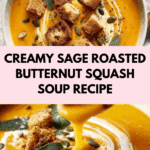 Sage Roasted Butternut Squash Soup is a creamy, comforting fall favorite made by roasting butternut squash, garlic, and onions with fresh herbs, then blending them into a smooth, flavorful soup. Garnished with crunchy roasted squash seeds and homemade croutons, this soup offers a delightful blend of savory, herbaceous, and nutty flavors, perfect for cozy dinners or entertaining guests.