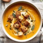 Sage Roasted Butternut Squash Soup is a creamy, comforting fall favorite made by roasting butternut squash, garlic, and onions with fresh herbs, then blending them into a smooth, flavorful soup. Garnished with crunchy roasted squash seeds and homemade croutons, this soup offers a delightful blend of savory, herbaceous, and nutty flavors, perfect for cozy dinners or entertaining guests.