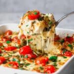 This image shows a close-up of a fresh baked casserole in a white dish, featuring several layers. The bottom layer appears to be chunky pieces of white chicken with grill marks. Over that is a layer of melted creamy cheese that stretches as it is lifted with a silver spoon. On top of the cheese are bright red roasted cherry tomatoes, green vegetables that look like chopped peppers, and small pieces of fresh green parsley scattered across the dish. The background is a clean white marbled surface. photo taken with an iphone --ar 4:5 --v 7