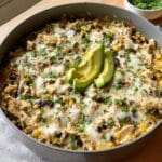 A flavorful and comforting one-pan meal featuring shredded rotisserie chicken, salsa verde, rice, beans, and veggies, all cooked together in a skillet for easy preparation and a delicious blend of Southwestern-inspired flavors.