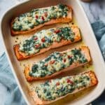 Keywords: baked salmon, stuffed salmon, spinach feta filling, healthy salmon recipe, Mediterranean salmon, oven baked salmon